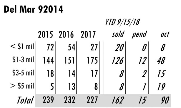 OCTOBER Issue Del Mar total MLS reported sales, active listings, month’s inventory supply, and median sales price** compared to the same period last year.