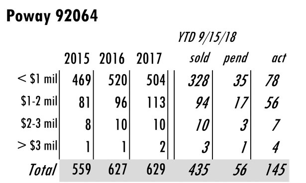 OCTOBER Issue Poway total MLS reported sales, active listings, month’s inventory supply, and median sales price** compared to the same period last year.