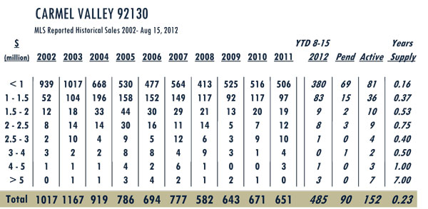Carmel Valley Luxury Real Estate 2012 YTD sales as of 8/15/12= 485 with 152 active listings currently on the market. In 2011 sales as of 8/15 = 400 and there were 298 active listings on the market. Year-over-year Carmel Valley has gone from a 5-month supply of inventory to just under a 3-month supply with inventory decreased by 49% and sales volume up by 21%.