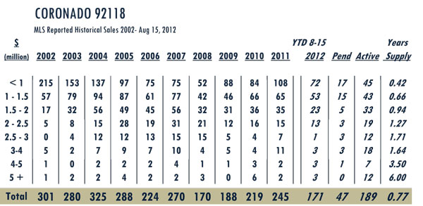 Coronado Luxury Real Estate 2012 YTD sales as of 8/15/12= 171 with 189 active listings currently on the market. In 2011 sales as of 8/15 = 147 and there were 250 active listings on the market. Year-over-year Coronado has gone from a 14-month supply of inventory to a 9-month supply with inventory decreased by 24% and sales volume up by 16%.