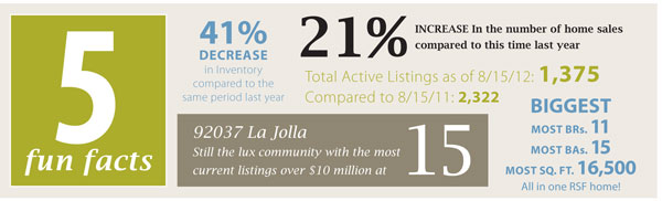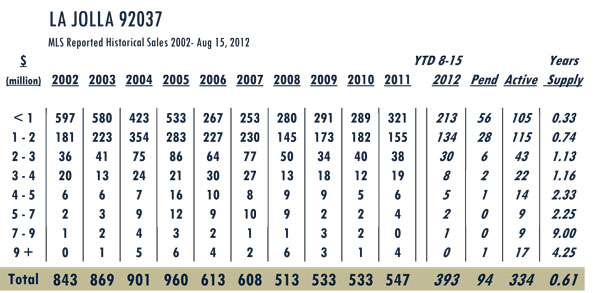La Jolla Luxury Real Estate 2012 YTD sales as of 8/15/12 = 393 with 334 active listings currently on the market. In 2011 sales as of 8/15 = 326 and there were 455 active listings on the market. Year-over-year La Jolla has gone from a 10-month supply of inventory to just a 7-month supply with inventory decreased by 27% and sales volume up by 21%.