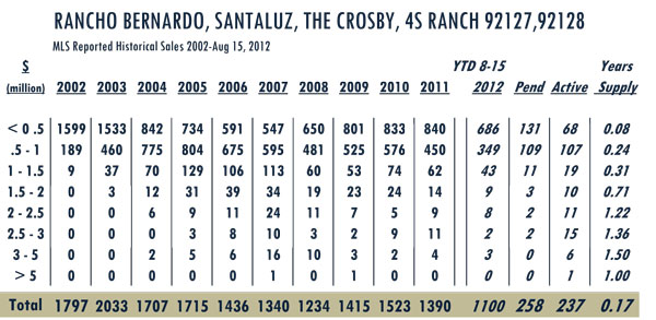 Rancho Bernardo, Santaluz, The Crosby, 4S Ranch Luxury Real Estate 2012 YTD sales as of 8/15/12= 1100 with 237 active listings currently on the market. In 2011 sales as of 8/15 = 851 and there were 580 active listings on the market. Year-over-year Rancho Bernardo has have gone from over a 4-month supply of inventory to a 2-month supply with inventory decreased by 59% and sales volume up by 29%.