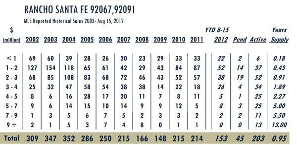 Rancho Santa Fe Luxury Real Estate 2012 YTD sales as of 8/15/12= 153 with 203 active listings currently on the market. In 2011 sales as of 8/15 = 143 and there were 291 active listings on the market. Year-over-year Rancho Santa Fe has gone from a 16-month supply of inventory to an 11-month supply with inventory decreased by 30% and sales volume up by 7%.