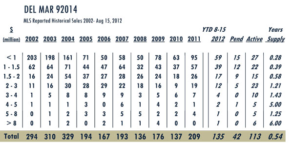 Del Mar Luxury Real Estate 2012 YTD sales as of 8/15/12 =135 with 113 active listings currently on the market. In 2011 sales as of 8/15 = 135 and there were 173 active listings on the market. Year-over-year Del Mar has gone from a 15-month supply of inventory to a 6-month supply with inventory decreased by 35% and sales volume even.