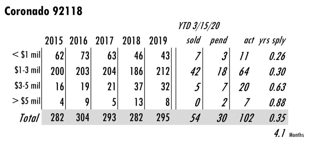 APRIL Issue Coronado total MLS reported sales, active listings, month’s inventory supply, and median sales price** compared to the same period last year.
