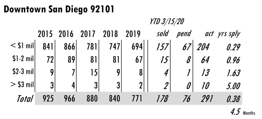 APRIL Issue Downtown San Diego total MLS reported sales, active listings, month’s inventory supply, and median sales price ytd 2019** compared to the same period last year.