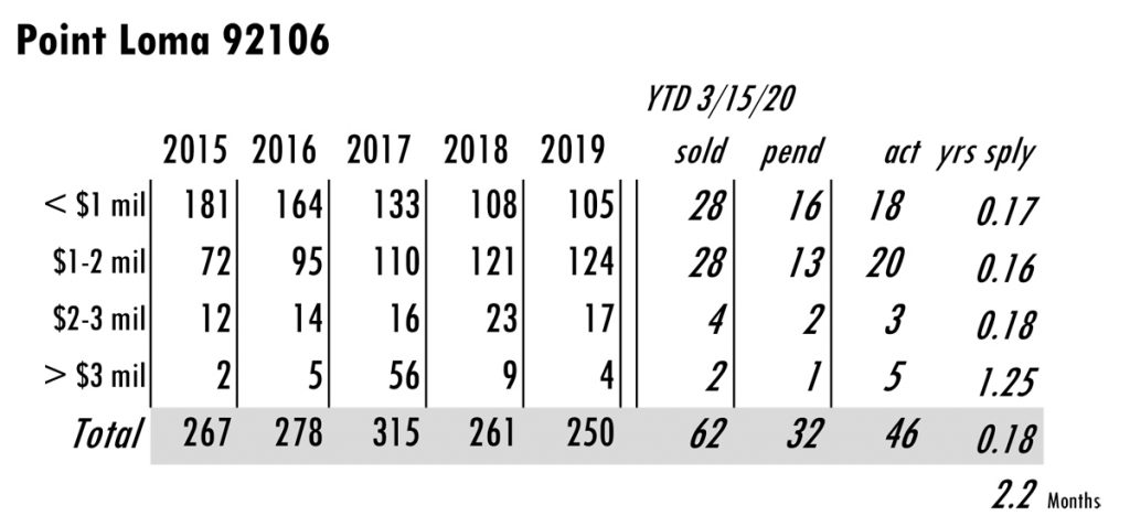 APRIL Issue Point Loma San Diego total MLS reported sales, active listings, month’s inventory supply, and median sales price** compared to the same period last year.