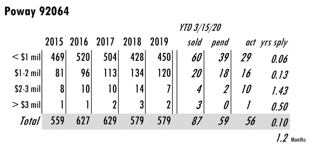 APRIL Issue Poway total MLS reported sales, active listings, month’s inventory supply, and median sales price** compared to the same period last year.